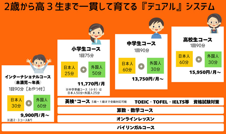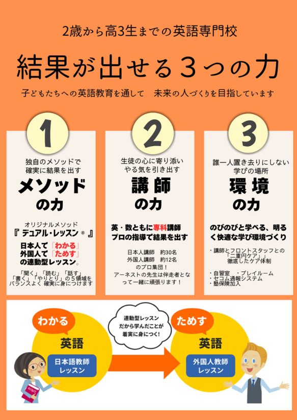 アーネスト英語学院は、独自のメソッド『デュアル・レッスン®』で指導を行う長野県にある英語専門校です。2歳から高校3年生まで一貫したカリキュラムにより、「聞く力」「話す力」はもちろん、英検や変化する学校・受験英語にも対応できる力が身につくと話題の地域密着型英語スクールです。