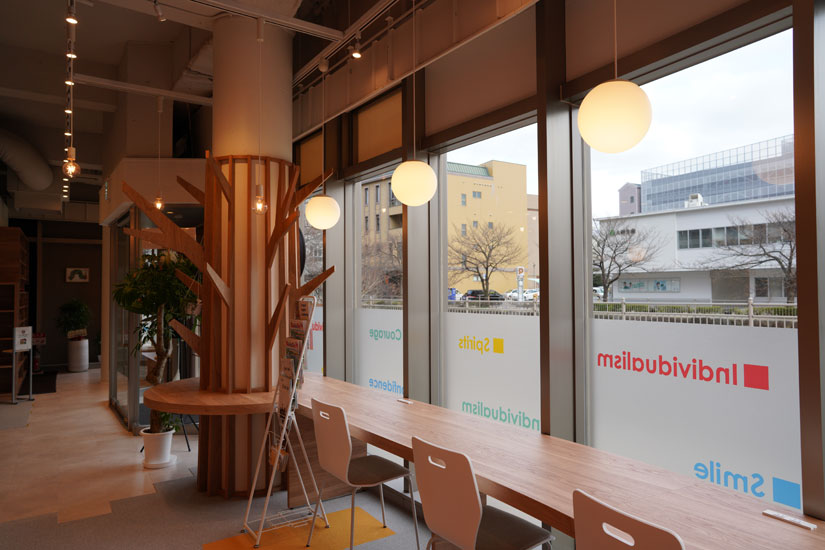 「アーネストの木」=シンボルツリーの下にみんなが集まるというコンセプトの優しい雰囲気漂うエントランス。大きな窓が開放的で、松本の町並みに明るくマッチしています。