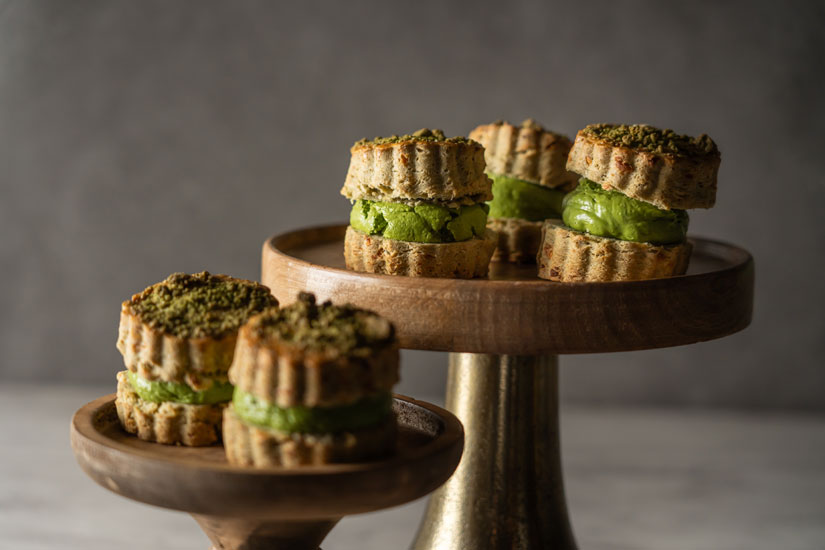 長野県の豊かな自然の中で育った天然の熊笹を丸ごと粉末にして使用した「クマザサスコーン」は、淡い緑色に、ほのかな笹の香りと、やさしい甘さを楽しめる一品。中には抹茶チョコレートクリームをたっぷりとサンドしています。