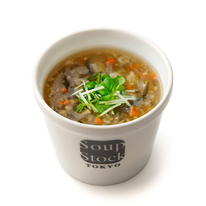 鶏、昆布、干し椎茸のだしのきいた和風スープに野菜や穀類を合わせた冬にピッタリなスープ。滋養味あふれるだしの旨味と生姜の風味を味わって。