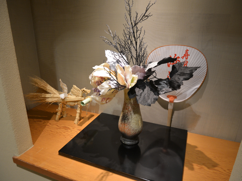 エントランス脇のニッチスペースにあるお花と藁細工が素敵。