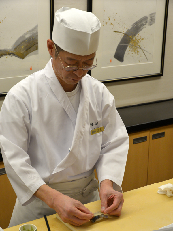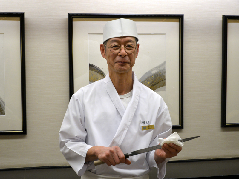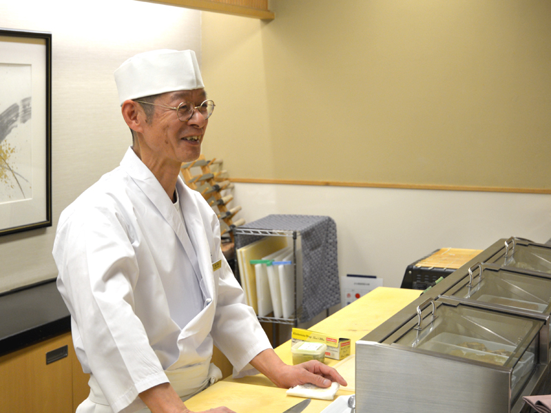 出迎えてくれたのは「寿司 海津」の調理長、坂本広一さん。大町市出身で高校卒業後から寿司職人の道に入り、ホテルメトロポリタン長野創業時からこちらのお店で寿司を握ってきた、職人歴40年以上の大ベテランです。