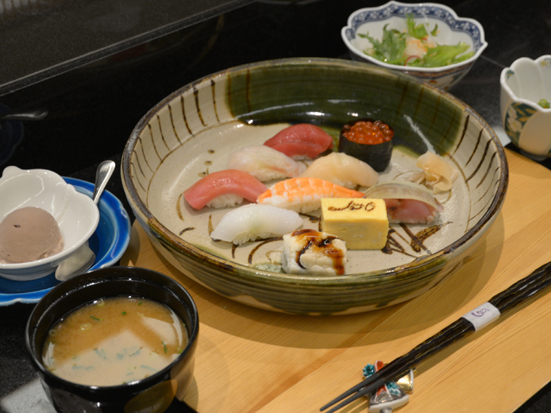 こちらが「沖」。握り9貫+玉子焼き、サラダ、小鉢、味噌汁、デザートという内容で、ランチとはいえリーズナブル!