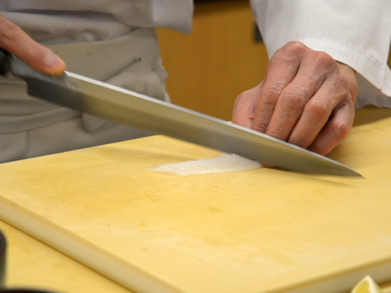 イカはそのままだと歯触りが固いので、口当たりを良くするために細工包丁を入れます。とても細かく包丁を菱状に入れます。