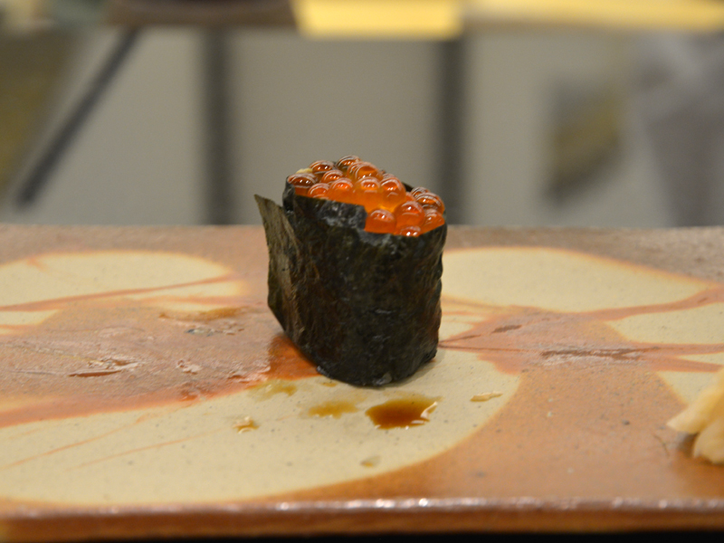 後半戦に入ってネタも濃い目のネタが登場。まずは中トロ。口の中でとろける柔らかさ。続いて先述の光物からしめ鯖。そしてイクラ軍艦。イクラは大ぶりでプチプチとしっかりした歯ごたえが楽しめました。