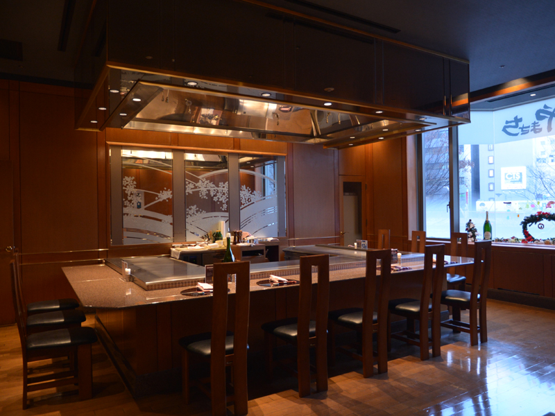 「鉄板焼 やまさち」の室内。眼前でライブ感満点の鉄板焼をいただけるお店です。