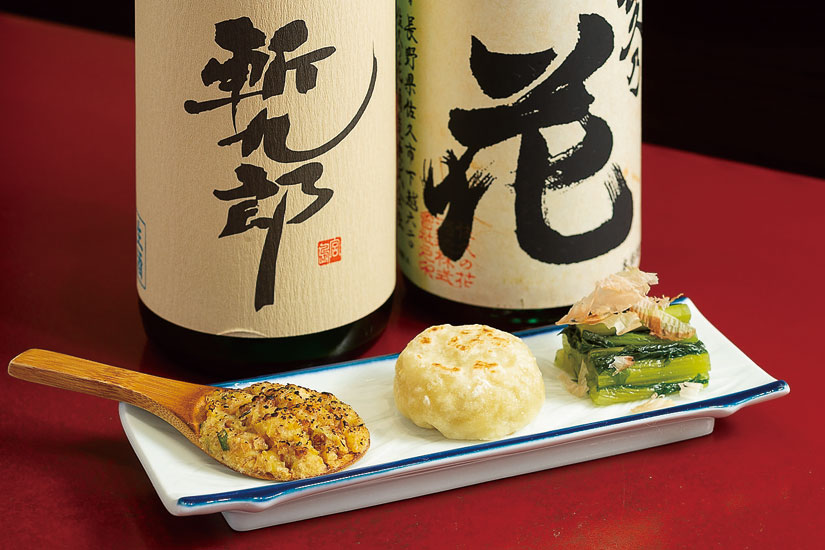 「蕎麦前三昧」(670円)は、そば焼き味噌、一口おやき、野沢菜漬けがセットになった一品。各種そろう地酒と一緒に楽しみたい。