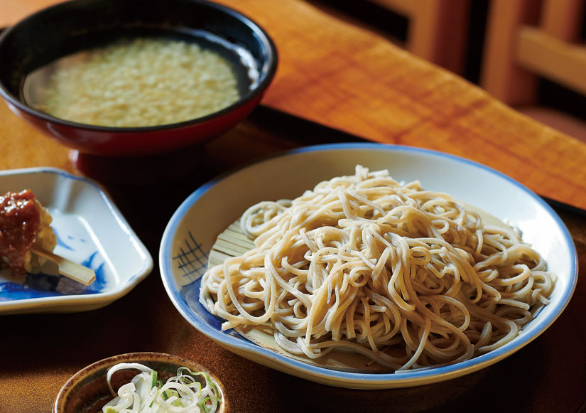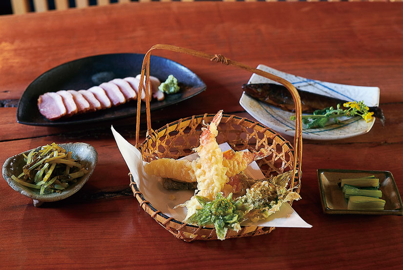 人気は十割そばにそば雑炊、くるみ味噌だれで味わうそば団子が付いた「蔵そば」。季節の天ぷらやタケノコの炭火焼き、鴨の燻製など一品料理もそろうから、地酒とともにぜひ。