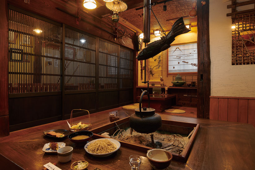 蔵の町・須坂らしいそば屋にしたいと店主自ら築いた空間は、飛騨高山の古材の柱や網代天井などが風情たっぷり。囲炉裏では岩魚や鮎を焼いたり、キノコ汁を作ることも。