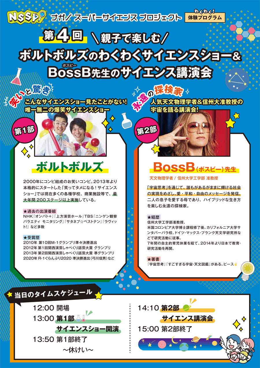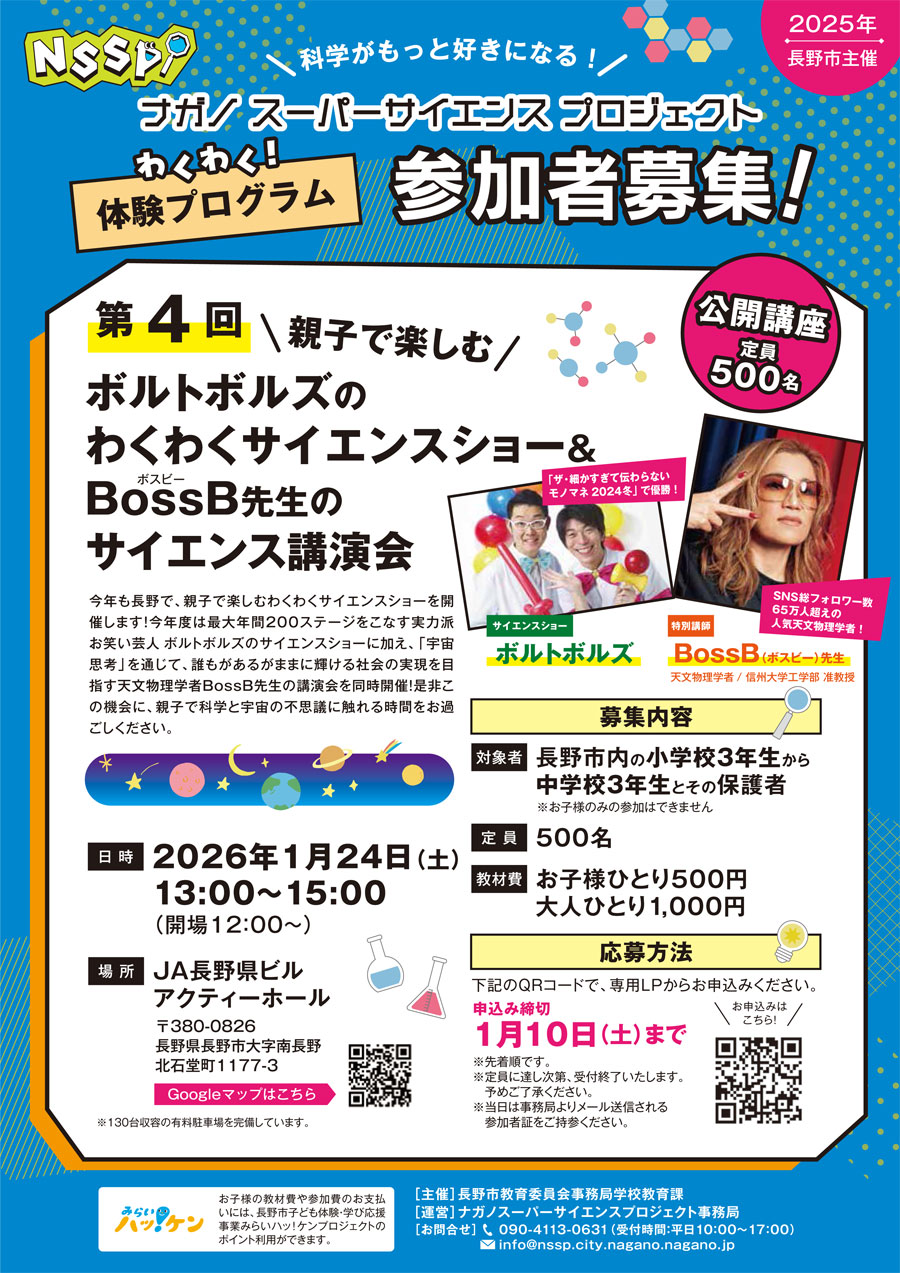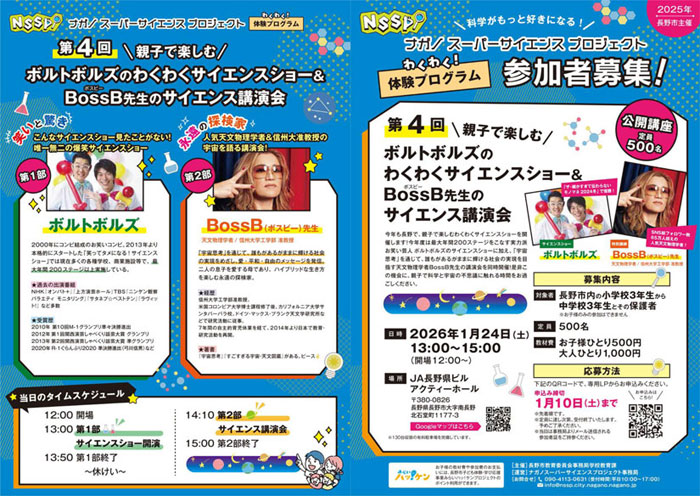 長野市で「ナガノスーパーサイエンスプロジェクト(NSSP)」の体験プログラム第4回として、親子で楽しめるサイエンスイベント『親子で楽しむボルトボルズのわくわくサイエンスショー&BossB先生(ボスビー先生)のサイエンス講演会』が、2026年1月24日(土)に開催。