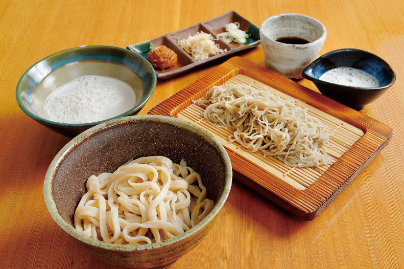 そばとうどんを半人前ずつ楽しめる「わがままセット」1,000円。ねずみ大根の辛みを保つ貯蔵法によって、季節を問わずおしぼり汁を提供。