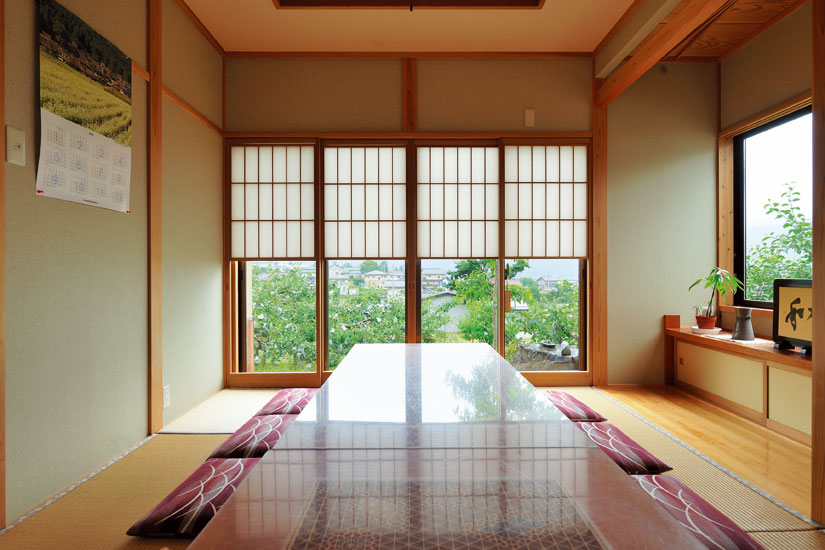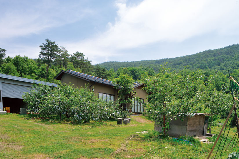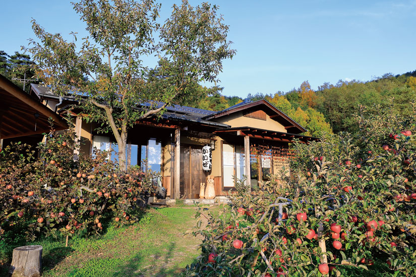 樹々に囲まれた敷地内では、山羊やウサギが愛らしい姿を見せてくれるのどかな風景が広がります。玄関で靴を脱ぎ、雪見障子越しにりんご畑を望む座敷席でほっと一息。