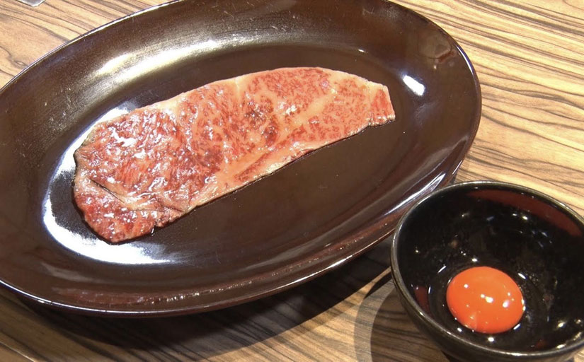 ディナータイムで楽しめる「焼肉ジャンボ」の定番メニュー「野原焼き」(2,300円)。薄切りのサーロインをさっと炙って生卵にからめていただきます。