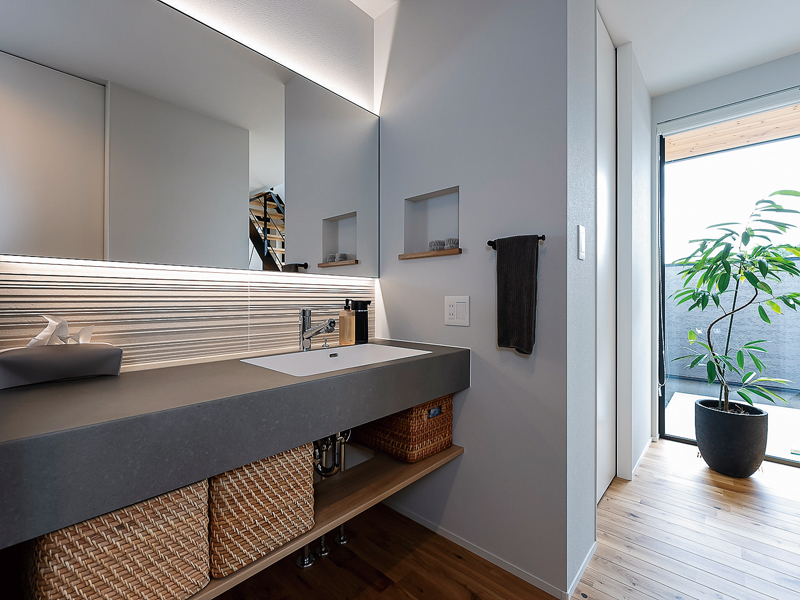 玄関からリビングへの動線上に幅広の造作洗面を設けました。大きな一枚鏡は奥さまのお気に入り。コーニス照明に照らされ豊かな表情を見せる鏡の下の壁は平田タイル。隣のトイレはハイドアで仕切られているので延びやかな印象です。