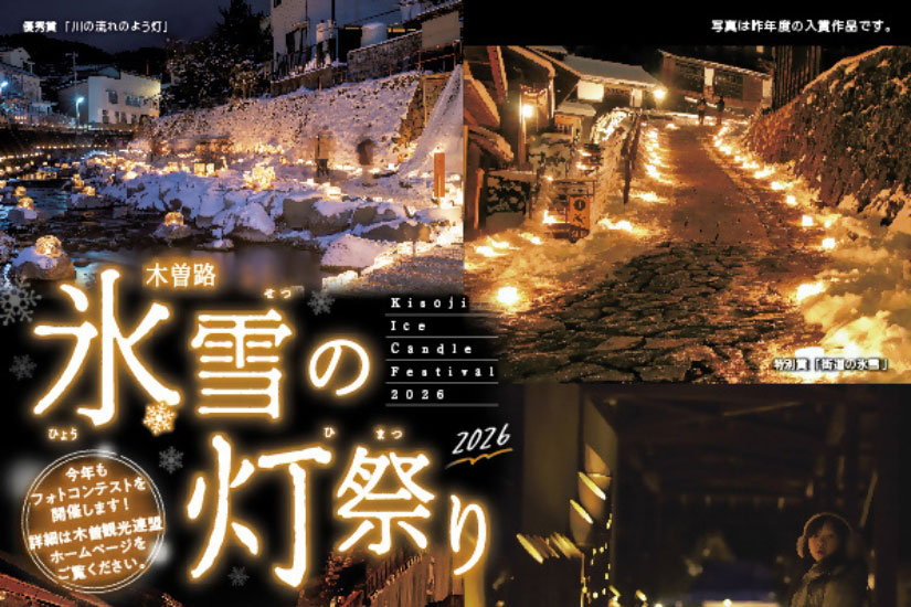 2026年1月24日(土)から2月14日(土)まで、長野県塩尻市の奈良井宿、南木曽町の妻籠宿をはじめとする木曽路内の宿場などを会場に、『木曽路 氷雪の灯祭り2026』が開催。江戸時代の面影を残す歴史ある町並みに地元住民が手作りしたアイスキャンドルや竹灯ろうが並び、冬ならではの表情を見せてくれます。期間中はフォトコンテストも開催。イベントの様子を切り取った作品の中から入賞者が選ばれ、木曽地域にちなんだ特産品がプレゼントされます。散策を楽しみながら写真を撮るのも、このイベントならではの楽しみ方のひとつですよ。