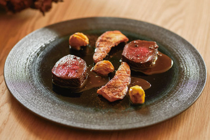 メインディッシュは信州鹿のロースに小海の白麗茸と小布施の栗を合わせた季節が感じられる一品。