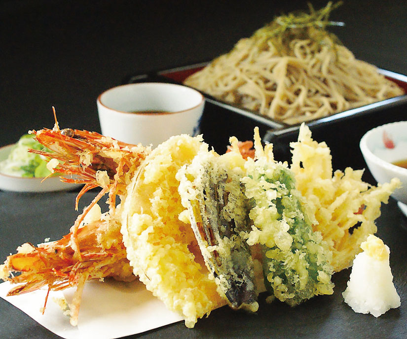 天ぷらは自社農園で育てた新鮮野菜をメインに、長野県産舞茸や大型有頭海老などの厳選素材を使用。