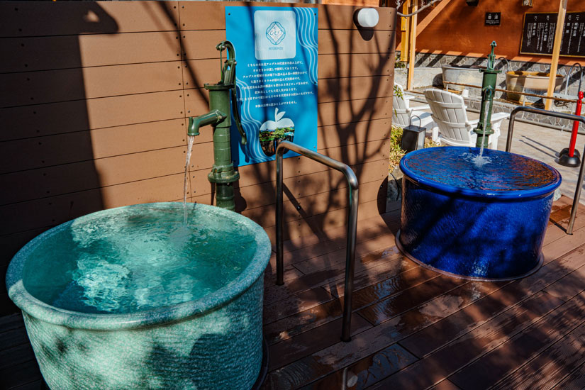 温度や入り方を選べる、多彩なお風呂が魅力の「おぶ~」。炭酸泉の湯や湯もみの湯、4種類のジェットバス、清流の湯、水風呂などがそろい、気分や体調に合わせた湯めぐりが楽しめます。その心地よさを支えているのが、館内すべてに使われるアルプスの伏流水。この伏流水を最新技術を用いて、身体にやさしい水(ナノ水)にして使用しています。