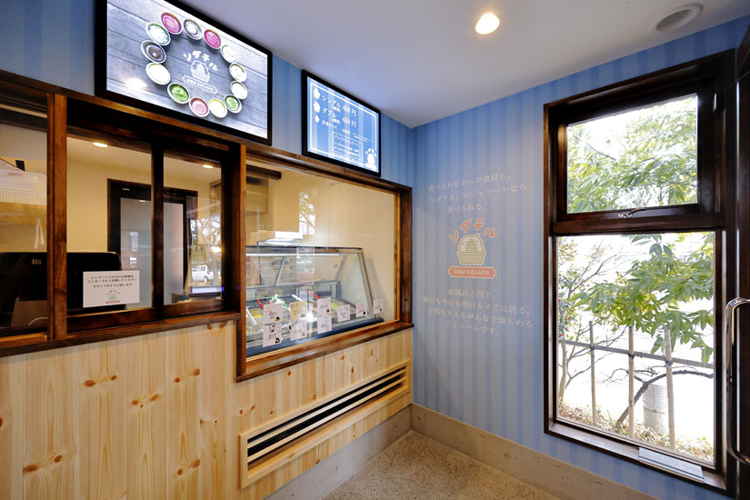 「林檎の湯屋 おぶ~」に併設する「OBU GELATO ソダテル本店」は、“食育”をテーマにしたジェラート店。搾りたて牛乳やチョコレートといった定番に加え、ニンジンやホウレンソウなど地元野菜を使ったジェラートを提供しています。野菜の風味を活かしながら、子どもでも食べやすい味わいに仕上げているのが特徴。ジェラートはすべて施設内で毎朝手作りされ、素材に合わせた組み合わせや配合が工夫されています。