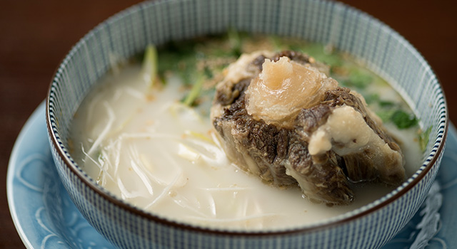 ゴロッとおおきな牛テールが入った「コムタンスープ」。牛テールの味わいをストレートに感じてもらえるよう3日間煮込み続け、旨味を最大限まで凝縮した一品。