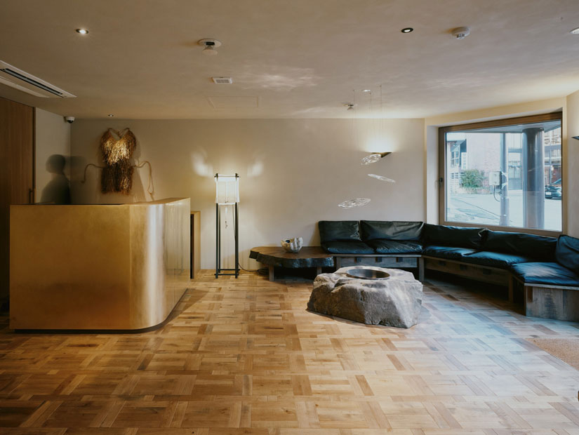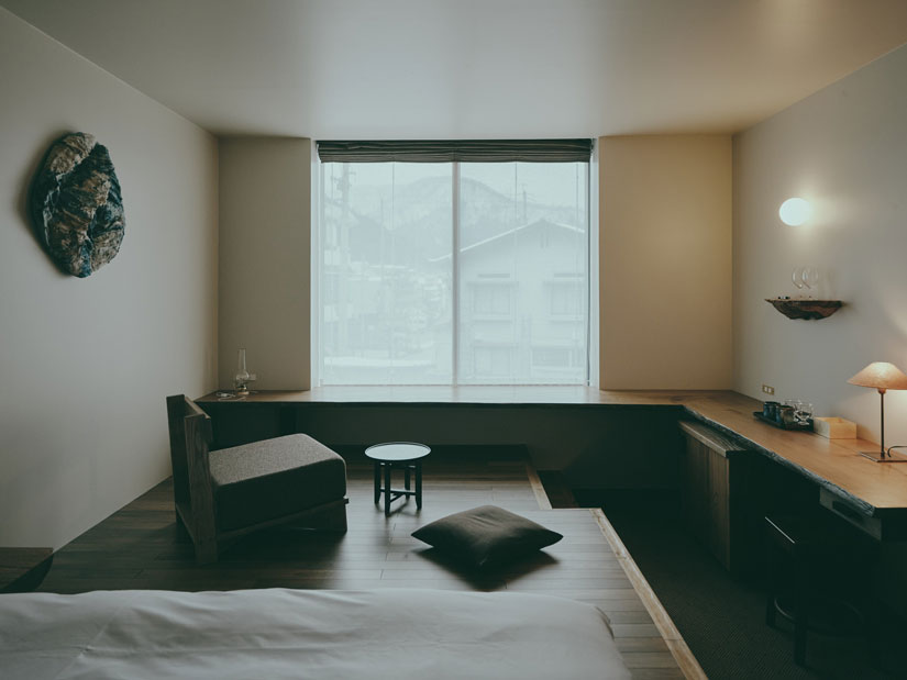 「mont」のコンセプトは、野沢温泉の土地を象徴する火と水です。火は伝統の火祭りである道祖神祭りを、水は温泉・雪・湧水を表現。生命の源でもある相反するふたつの要素が生み出すエネルギーをデザインやサービスに取り入れているのが特徴。「旧白樺」をリノベーションした館内には、何十年も使用されていなかった場所を蘇らせながら、「旧白樺」時代の階段や梁をそのまま残しています。道祖神祭りの際に使用されたまきやみのなどを館内に展示し、火・水を象徴するアートが各客室にも配置されています。