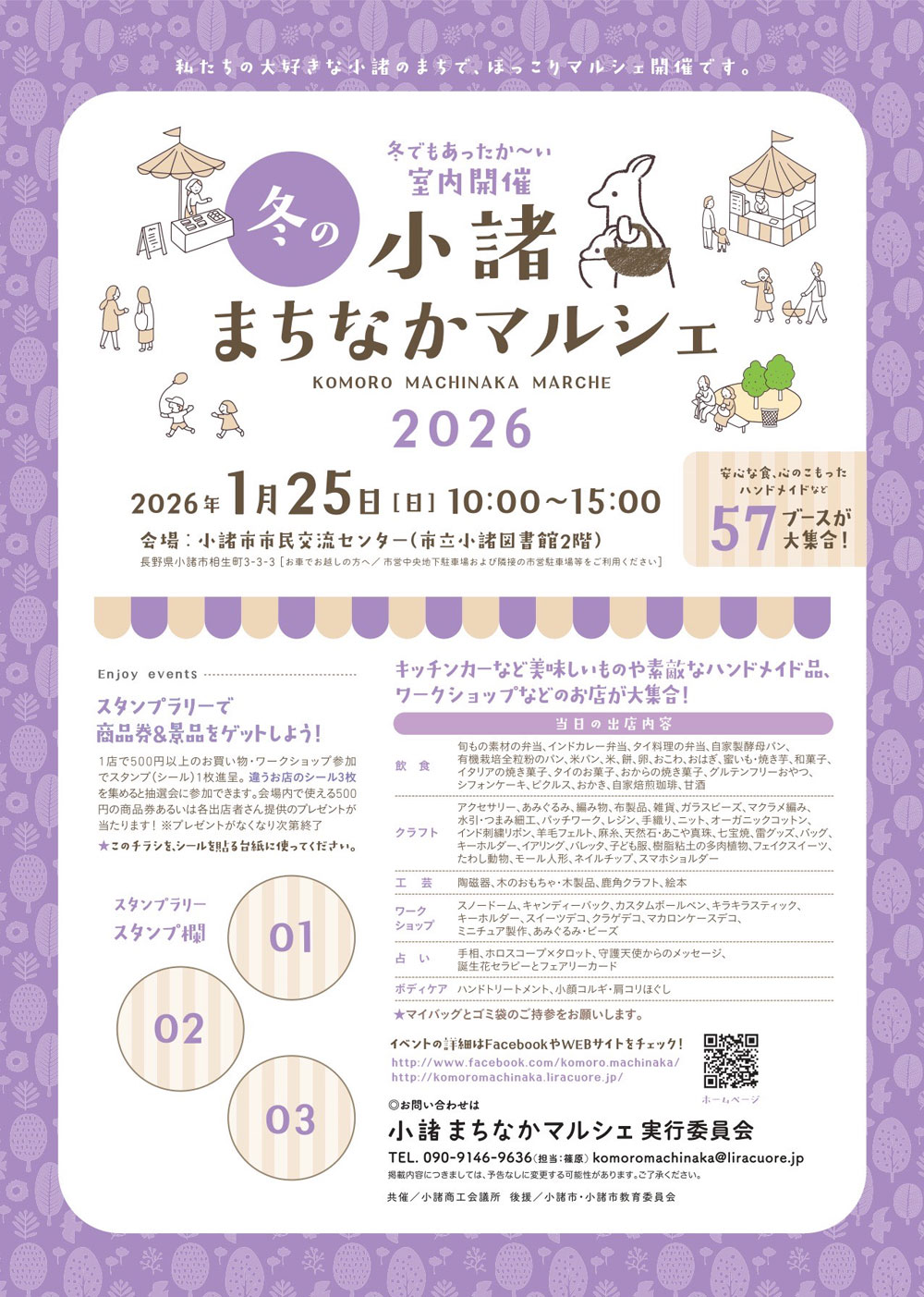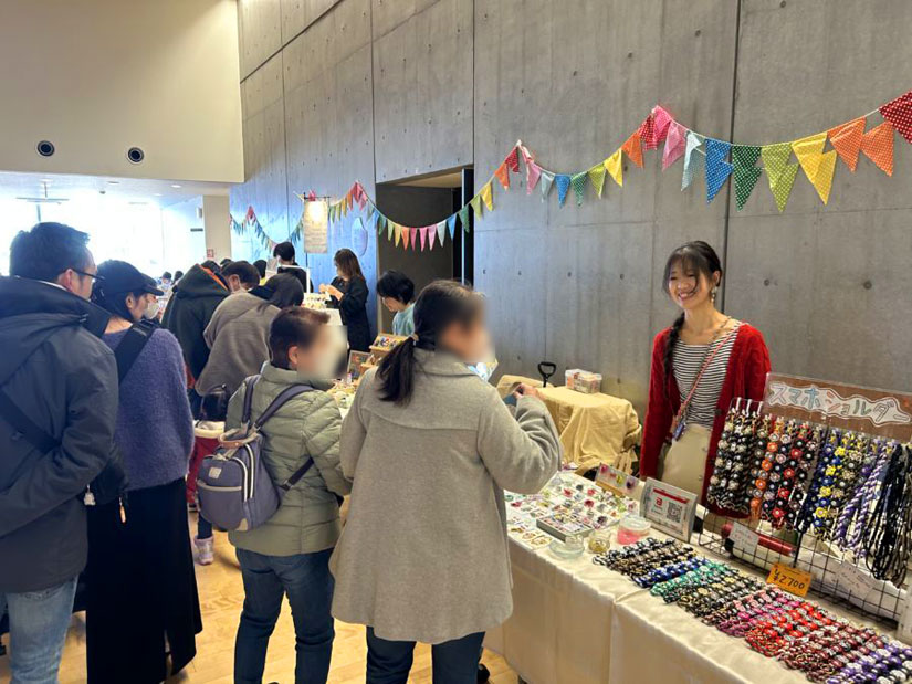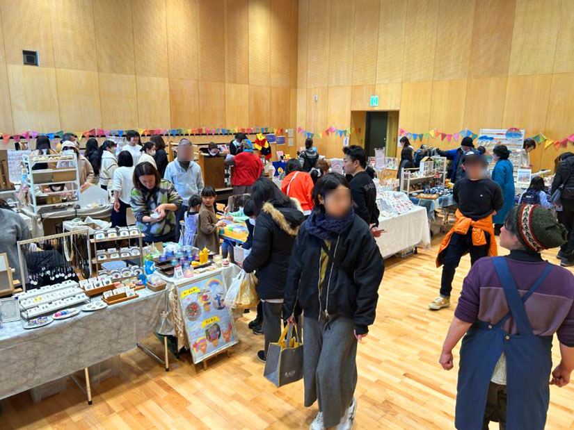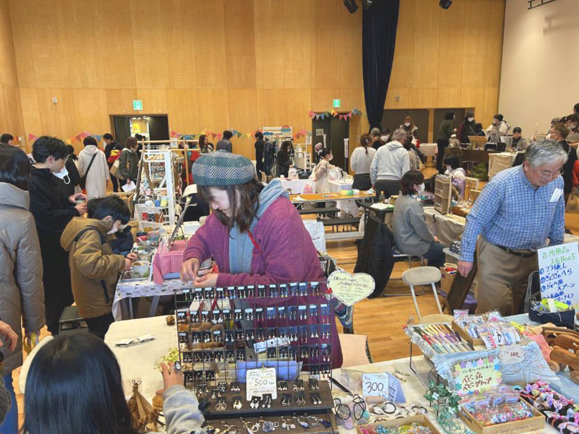 「小諸市立小諸図書館」2階にある「市民交流センター」を会場に、焼き菓子・パン・カレー・コーヒーなど多彩な飲食店をはじめ、アクセサリーや雑貨といったクラフト、占いブースなど57店が集結。