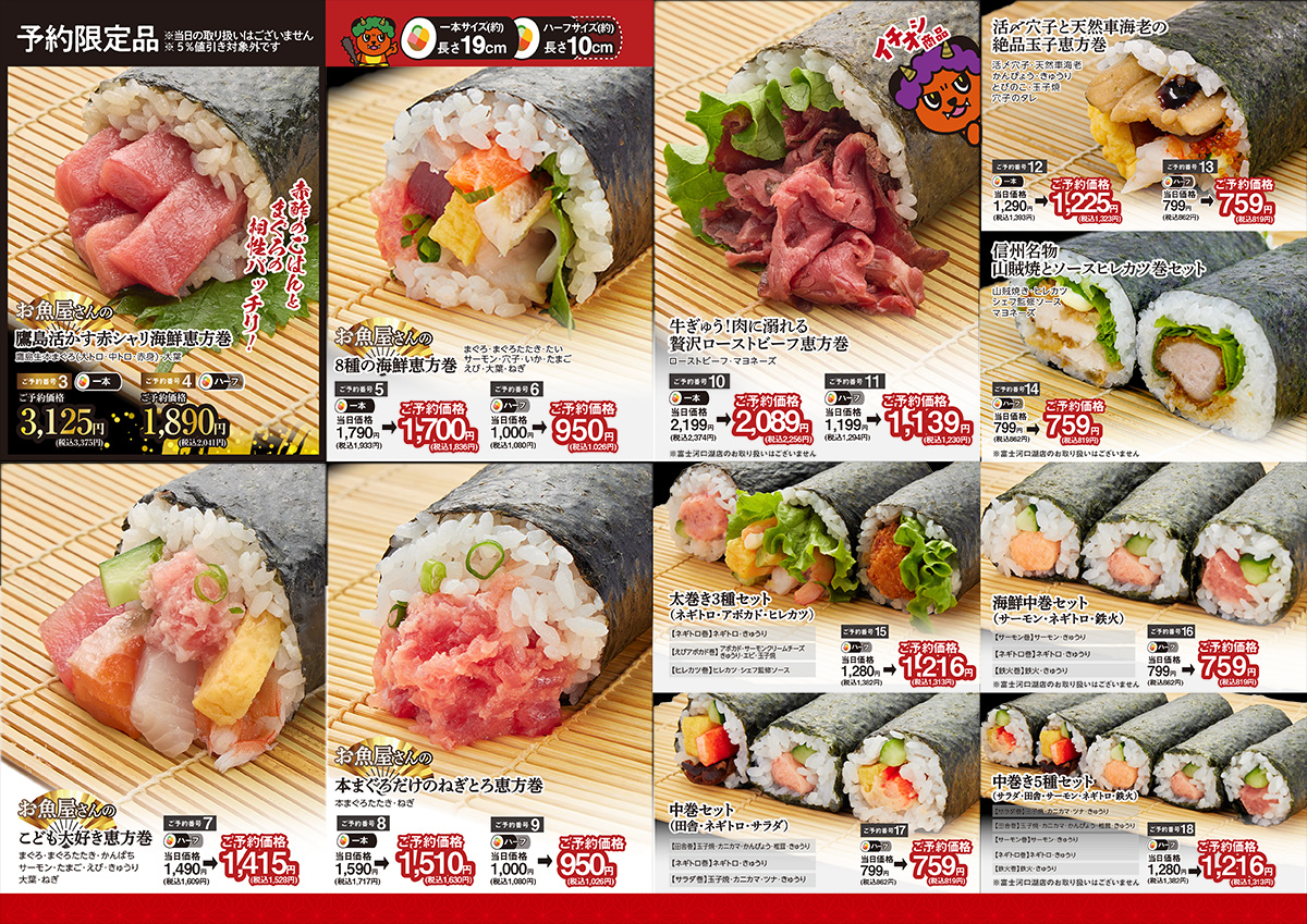 ホテルやレストラン出身のシェフを起用し、「グローサラント」(グロサリーとレストランを合わせた造語)を備えて本格的な味わいを提供する惣菜自慢の綿半ならではの恵方巻も多数そろいます。