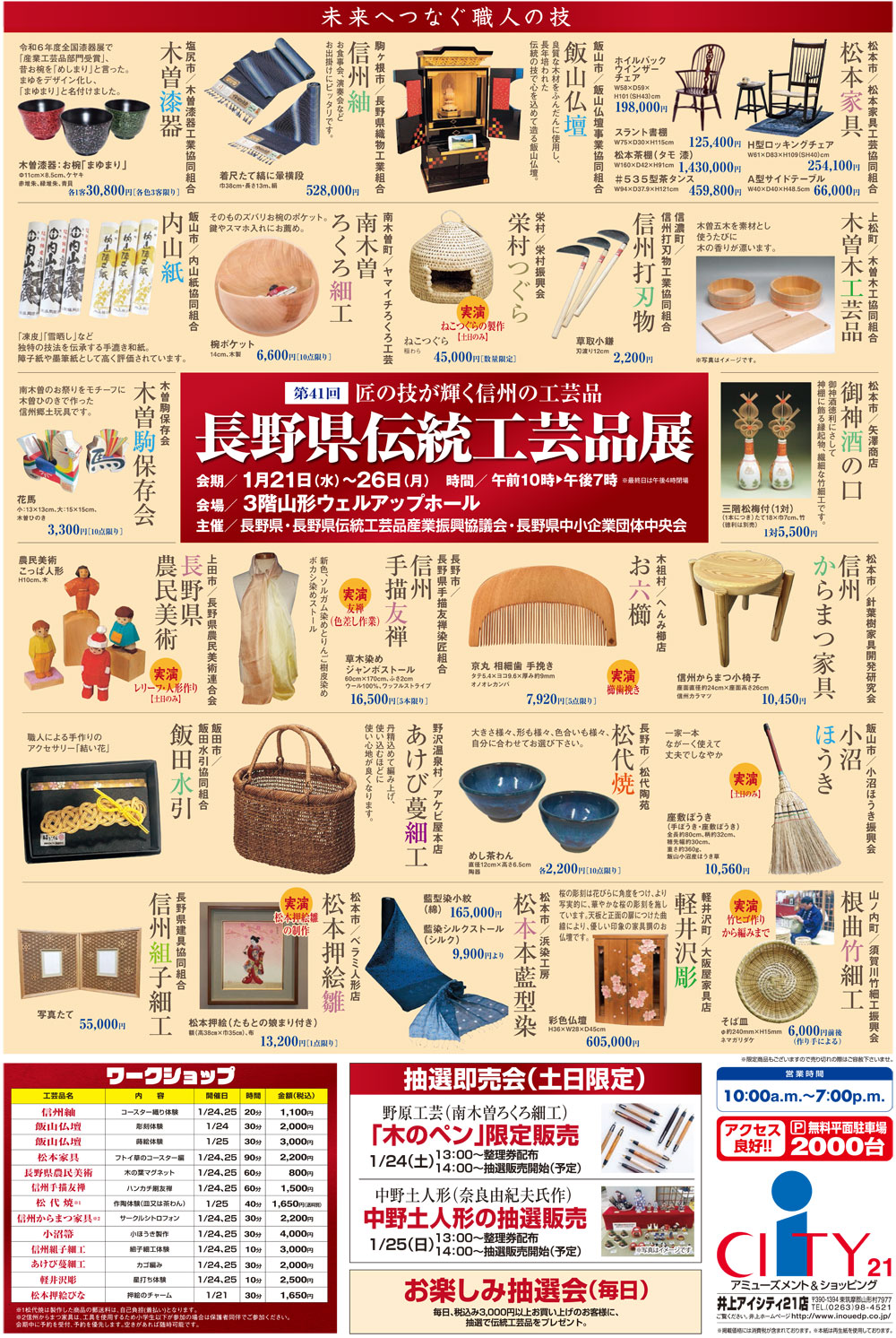 長野県の職人たちが手がけた多彩な伝統工芸品の展示・実演販売。「木のペン」限定販売や中野土人形の抽選販売も行われるほか、日時限定でものづくり体験ができるワークショップも行われます。