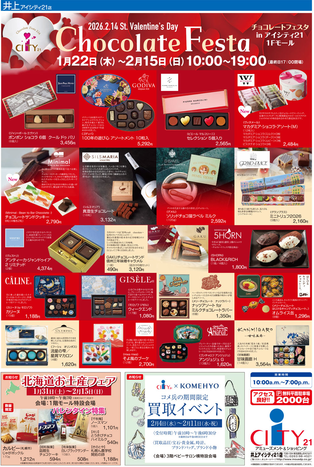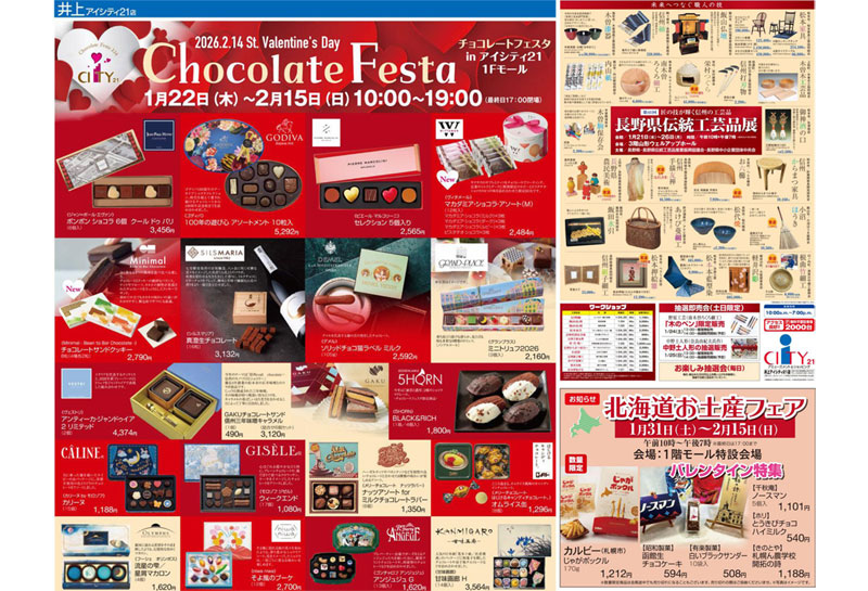 松本市に隣接する山形村の大型複合商業施設「井上アイシティ21」で、バレンタインイベント『Chocolate Festa(チョコレートフェスタ)』が、2026年1月22日(木)~2月15日(日)にかけて開催。