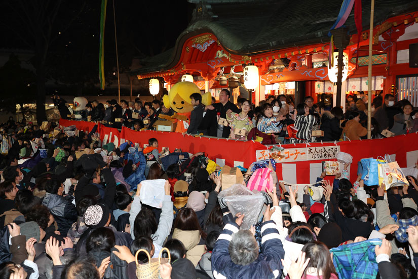 太鼓の合図をもって豆まきが開始。「鬼は外、福は内」の声とともに福枡に入った炒り豆・餅・みかん・福銭・お菓子等がまかれます。小学生以下の子どもだけが入って受け取れる専用コーナーも。