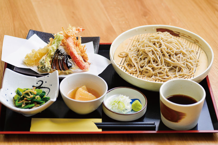 毎日手打ちする香り豊かなそばと、店主こだわりの昆布やカツオ節を使用した出汁香る一品料理が楽しめる店です。ランチ限定の「手打ちそばセット」(990円)は、打ちたての風味豊かなそばに、サクサクの天ぷら盛り合わせと日替わりの小鉢がふたつ付いて1,000円以内と財布にもやさしいのが魅力。