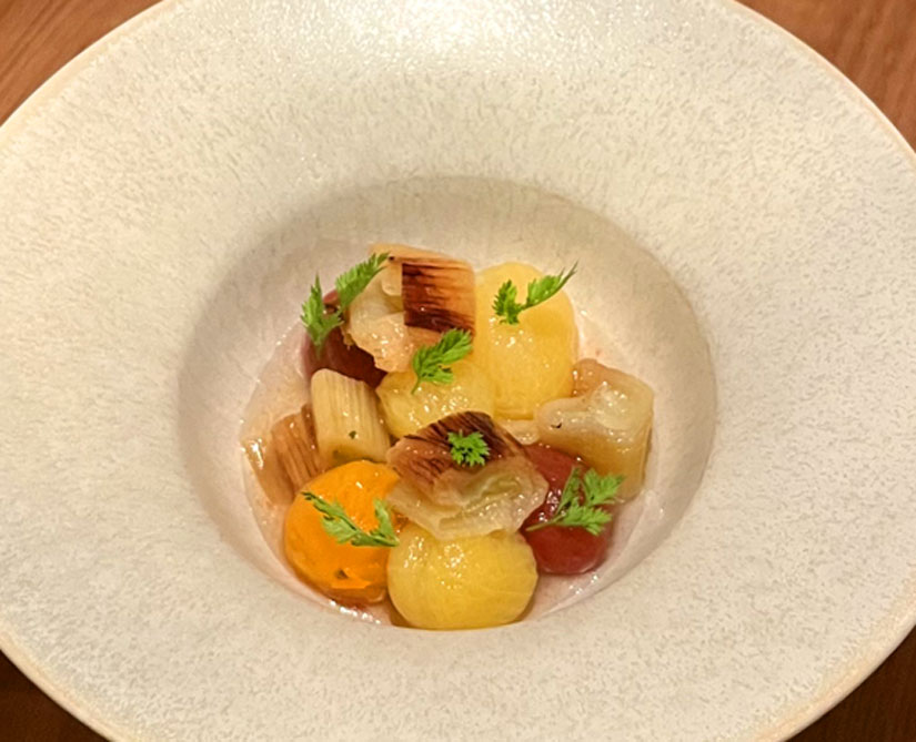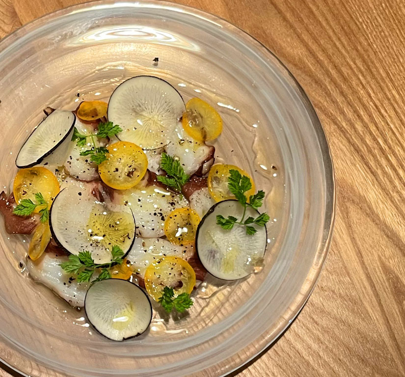 左:「蛸のカルパッチョ」金柑と黒大根、今の季節は白菜のソースとオリーブパウダーで。