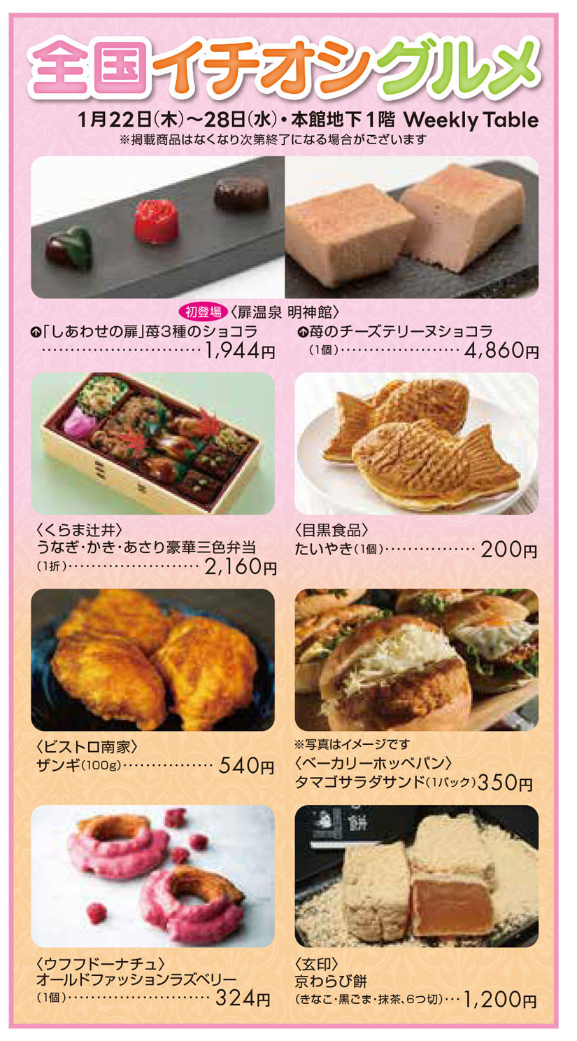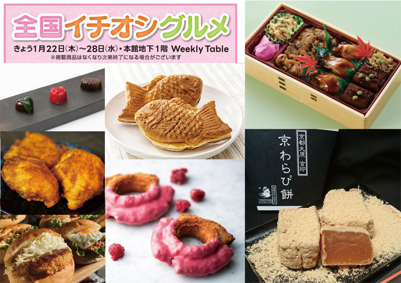 松本を代表する温泉宿〈扉温泉 明神館〉が初出店。苺3種のショコラや苺のチーズテリーヌショコラが登場します。さらに、京都から〈くらま辻井〉のうなぎ・かき・あさりのお弁当、東京の〈目黒食品〉のたいやき、北海道からは〈ビストロ南家〉のザンギ、金沢に本店があり軽井沢に支店を持つ〈ウフフドーナチュ〉のドーナツなどが集結します。