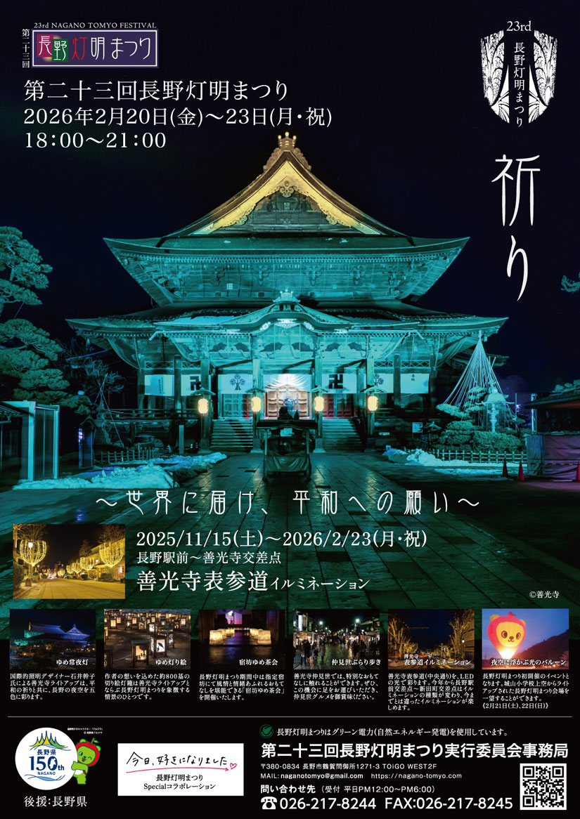 2026年2月20日(金)から2月23日(祝・月)まで、長野県長野市の善光寺とその周辺で、『第23回長野灯明まつり』が開催。今年も国際的照明デザイナー・石井幹子氏による善光寺のライトアップや切り絵の灯籠展示が行われるほか、「MOROHA」のラップ担当・アフロさんのスペシャルライブや、恋愛リアリティショー「今日、好きになりました。」出演者によるスペシャルトークショー、ラーメンフェスタ、熱気球体験など、多彩なプログラムが用意されています。
