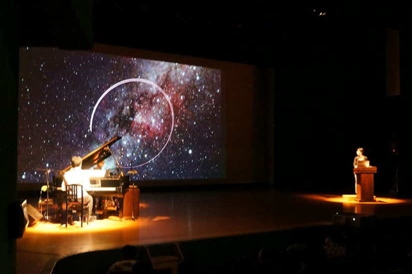 大型スクリーンに映る星雲と星を思わせる映像と、美しい音楽との幻想的なコラボレーションが楽しめるイベント。ピアノ演奏と講演が行われます。当日受付で先着順。