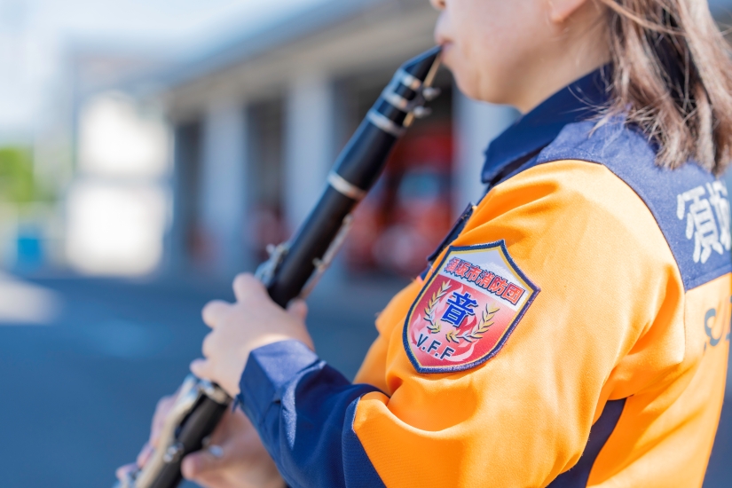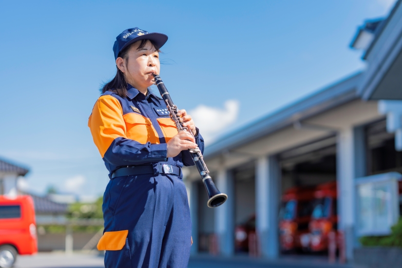 消防団の音楽隊として、定期演奏会やパレードなどで防火啓発活動に参加する田中優子さん。クラリネット奏者として、仲間と演奏の練習をする時間が活力源だといいます。