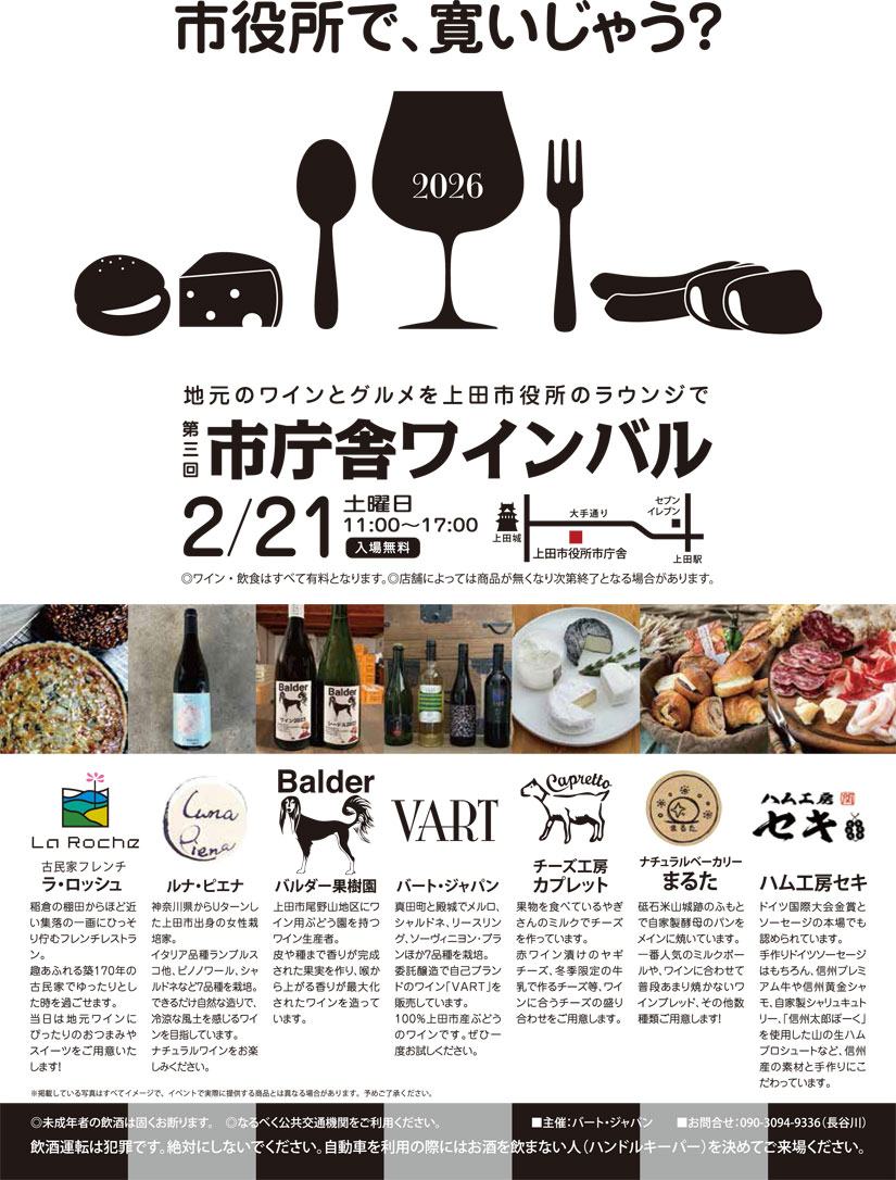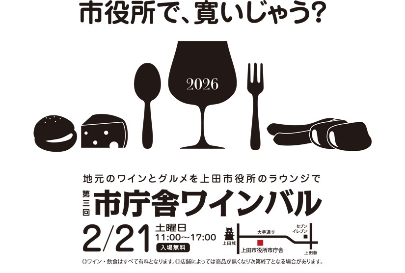 2026年2月21日(土)に長野県上田市の上田城大手通り沿いにある上田市役所内のラウンジで『第3回 市庁舎ワインバル』が開催。当日は上田市内のワイナリー・ぶどう生産者や古民家フレンチ、チーズ工房、ハム工房、ベーカリーなどが出店。ワインとともに、チーズ、パン、ソーセージなどを楽しんで。