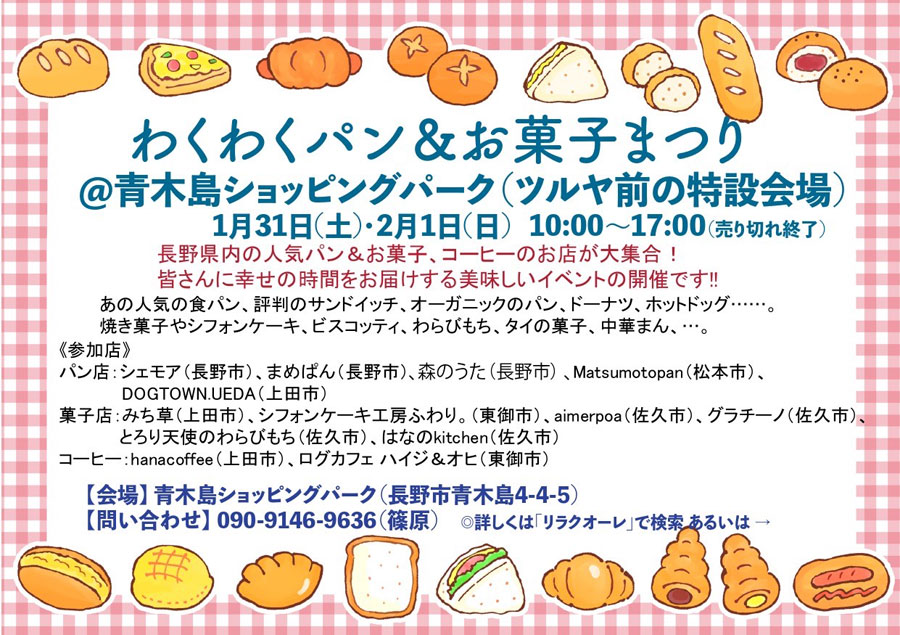 長野県長野市で、パンマルシェ+お菓子マルシェ『わくわくパン&お菓子まつり@青木島ショッピングパーク』が、2026年1月31日(土)、2月1日(日)に開催。