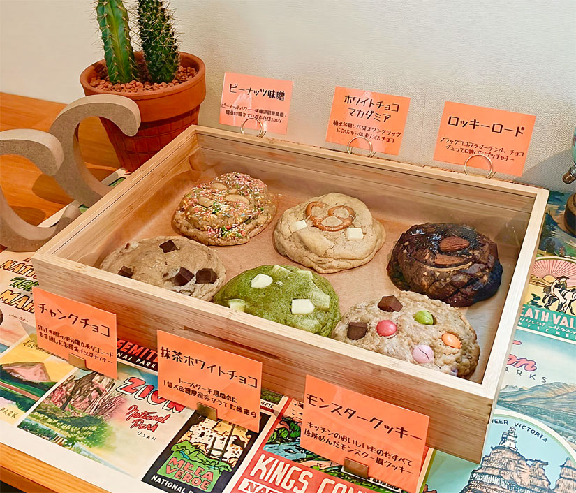 パン屋の技術で焼き上げる本格的なアメリカンクッキーは、分厚くて、しっとり濃厚、具材がゴロゴロ入っているのが特長。クッキーの生地には、香り高い「国産発酵バター」、ミネラル豊富でコクのある「素焚糖(すだきとう)」、そして北海道産小麦を使用していること。ねっちりとした独特の食感は、この素材へのこだわりが生み出しているんだそう。「チャンクチョコ」や「抹茶ホワイトチョコ」など全6種類を提供しています。