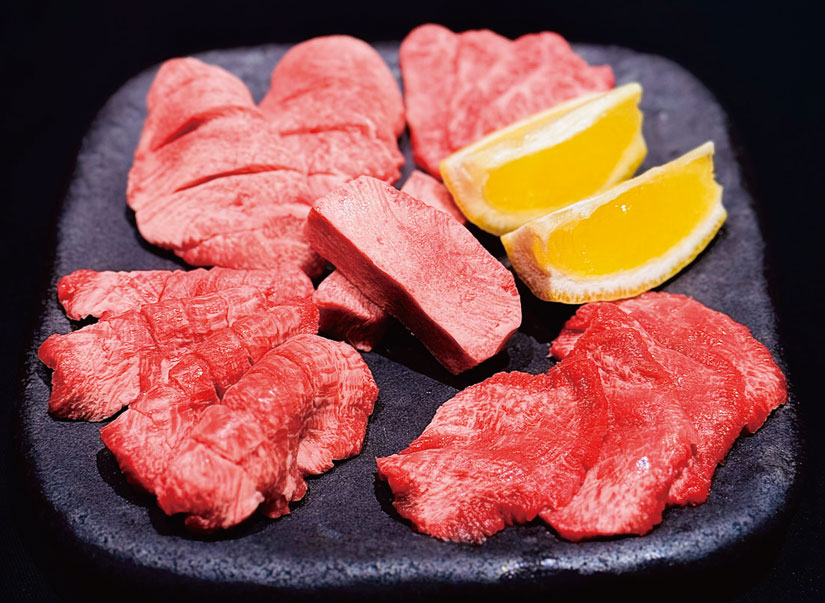 1プレート2人前、1日4プレートのみ提供。国産牛タン使用。タン元厚切り短冊、厚切り上タン、上タン、タン先、タンカルビの5点盛り。