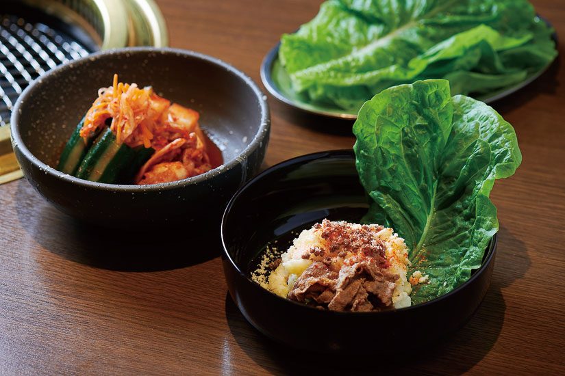 一頭のバラ肉でも可食部は25%とかなり少なく、周りの脂は仕込みの段階できれいに削ぎ落とされ、磨き上げています。なかでもおすすめの「上ロース」は、肩ロースの中でもサシがきれいに入ったトンと呼ばれる部位。「上カルビ」も同じく、あまり他店では見ることのないサミと呼ばれる柔らかい部位を提供するなど、希少な肉を味わえます。カイノミやマクラなど単体メニューで提供されるような部位も、あじ源ならひと皿の中に盛り付けられ、さまざまな部位を同時に楽しめるのも魅力。焼き上げた大ぶりの肉は、食べやすい大きさにハサミでカット。余分なドリップを取り除き、ある程度休ませてから提供るというこだわりの肉は臭みもなく、和牛の旨みを存分に味わえます。