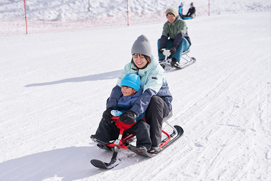 ソリ専用ゲレンデには動く歩道も設置されているので、小さな子どもでも安全に何度も遊べます。ハンドルとブレーキ付きの「スノーレーサー」も爽快感抜群!