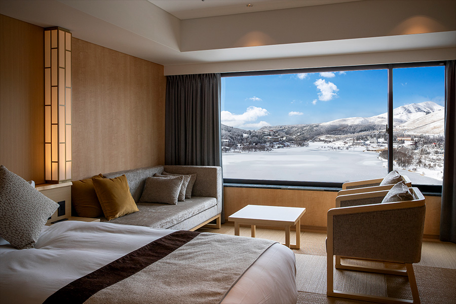 新本館の客室「デラックスレイクビュールーム」は高原の絶景と和モダンの空間にみんなが癒されます。