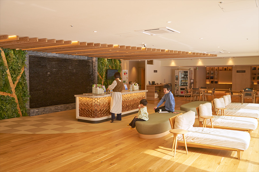 温泉の後は、木目と間接照明のぬくもりあふれる湯上りラウンジでゆっくりと。