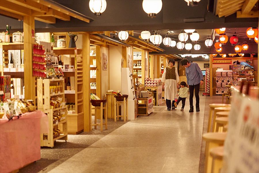新本館3階にある屋内型温泉街「しらかば仲見世」では、長野県内の地酒や郷土食、伝統工芸品などがそろい、信州の魅力を五感で体験できます。