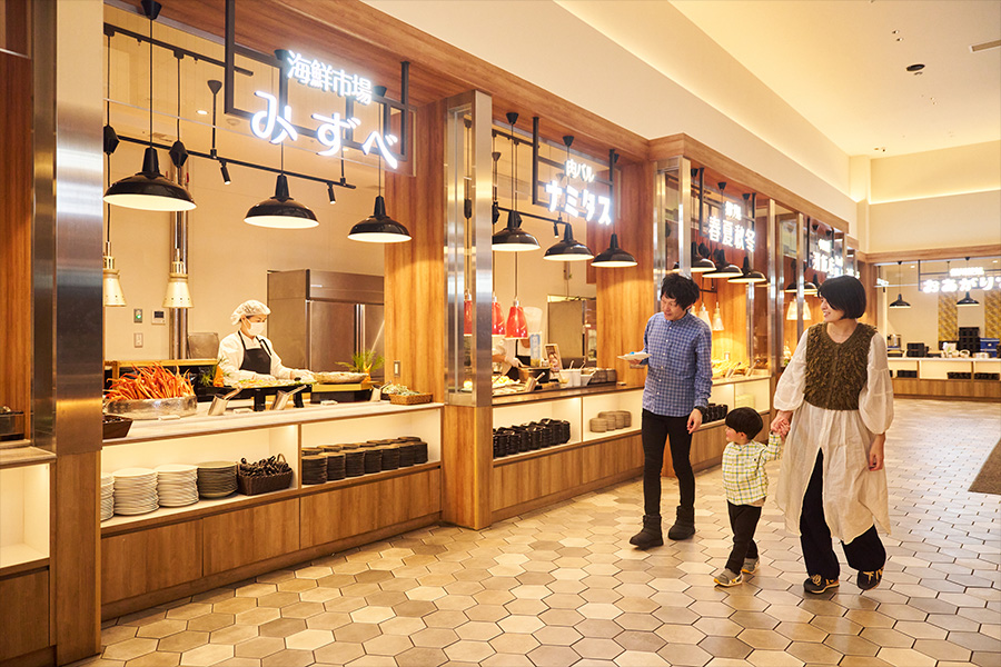 海鮮市場「みずべ」、肉バル「ナミタス」、中華料理「湖飯店」、郷土料理「よらっしゃれ」など、13の個店とコーナーから季節のメニューが提供されます。