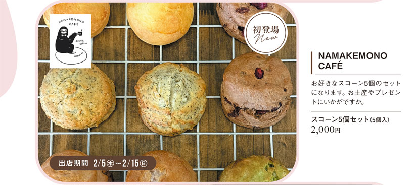 「ナマケモノカフェ」は、ながの東急百貨店オリジナルメニュー「ストロベリーパフェ」や「クリームチーズといちごジャムのチョコスコーンさんど」に加え、スコーン5個セットなども販売。
