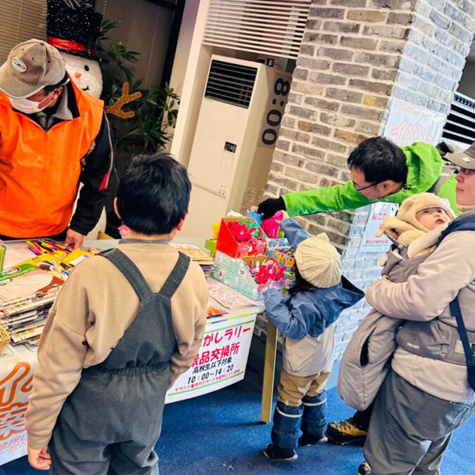 雪原に隠された宝を子ども用スコップで探す宝探し。未就学児から小学生が対象。