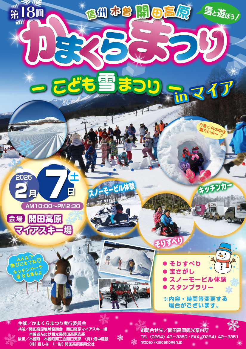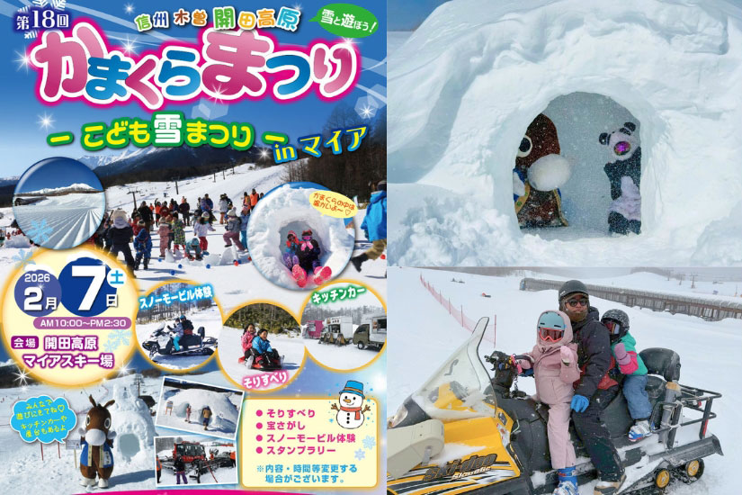 2026年2月7日(土)に長野県木曽町の「信州開田高原マイアスキー場」で『第18回 信州木曽開田高原 雪と遊ぼう!かまくらまつり―こども雪まつり― in マイア』が開催。スキー場ならではの雪遊びイベントとして、家族みんなで楽しめる内容が盛りだくさん。そりすべりや宝さがし、スノーモービル体験、スタンプラリーなど、子連れ家族が冬の自然を満喫できるプログラムが用意されています。