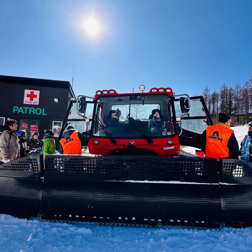 圧雪車の運転席に乗って記念撮影!スキー場ならではの体験を楽しんでみて。